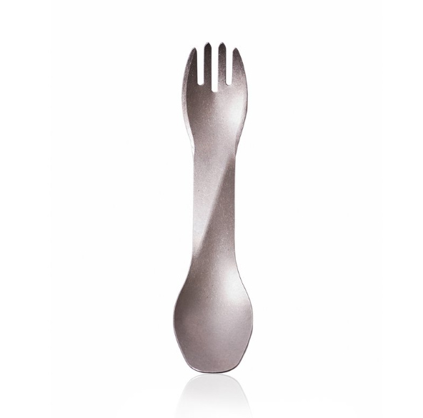 – Minimalist utensil with both spoon and fork ends